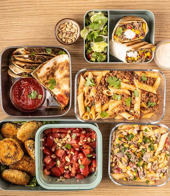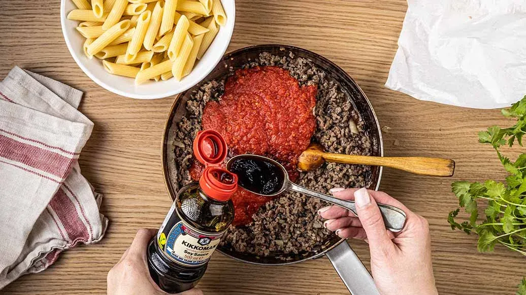Kıyma, mantar, soğan ve domates beş farklı yemeğin temelini oluşturuyor. Bir kez topluca pişirin. Ardından makarna, darı veya tortilla ile servis edin. Tüm malzemeler, Kikkoman Soy Sauce ile zenginleştirilmiş domates sosu sayesinde bir araya getiriyor.