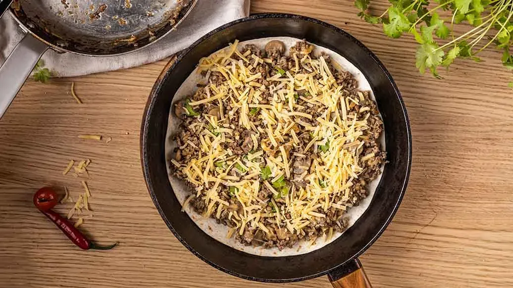 Tortilla’yi yağsız tavaya yerleştirin. İç harcı yarısının üzerine yayın, 50 gram kadar rendelenmiş peynir serpin. Ardından tortilla’yı katlayın. İki tortilla kullanıyorsanız, üzerini ikincisiyle kapatın. Her iki tarafını altın rengi ve çıtır çıtır olana kadar pişirin. Baharatlı domates sosuyla servis yapın.