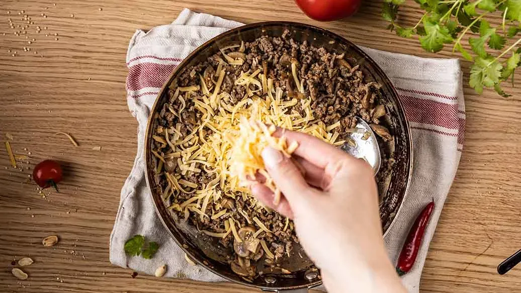 1 yemek kaşığı bitkisel yağ – 0,5 doğranmış soğan – 100 gr mantar – 150 gr dana kıyma – 1 yemek kaşığı Kikkoman Doğal Olarak Fermente Soya Sosu – 2 gr doğranmış kişniş – 50 gr rendelenmiş peynir (örneğin, Cheddar)