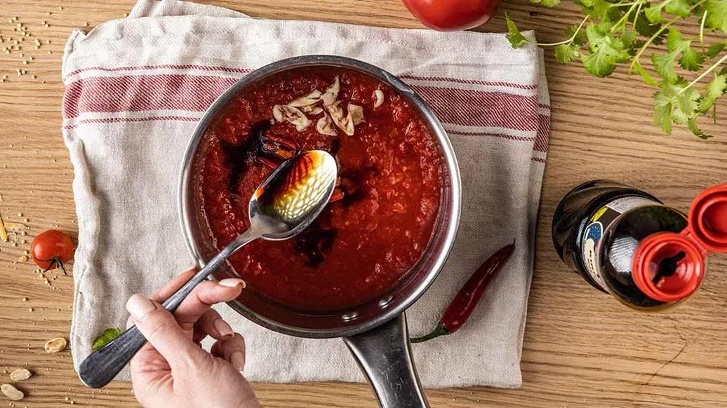 200 gr konserve doğranmış domates – 1 diş doğranmış sarımsak – 0,5 doğranmış kırmızı acı biber – 1 yemek kaşığı Kikkoman Doğal Olarak Fermente Soya Sosu – 3 yemek kaşığı şeker – 3 yemek kaşığı pirinç sirkesi