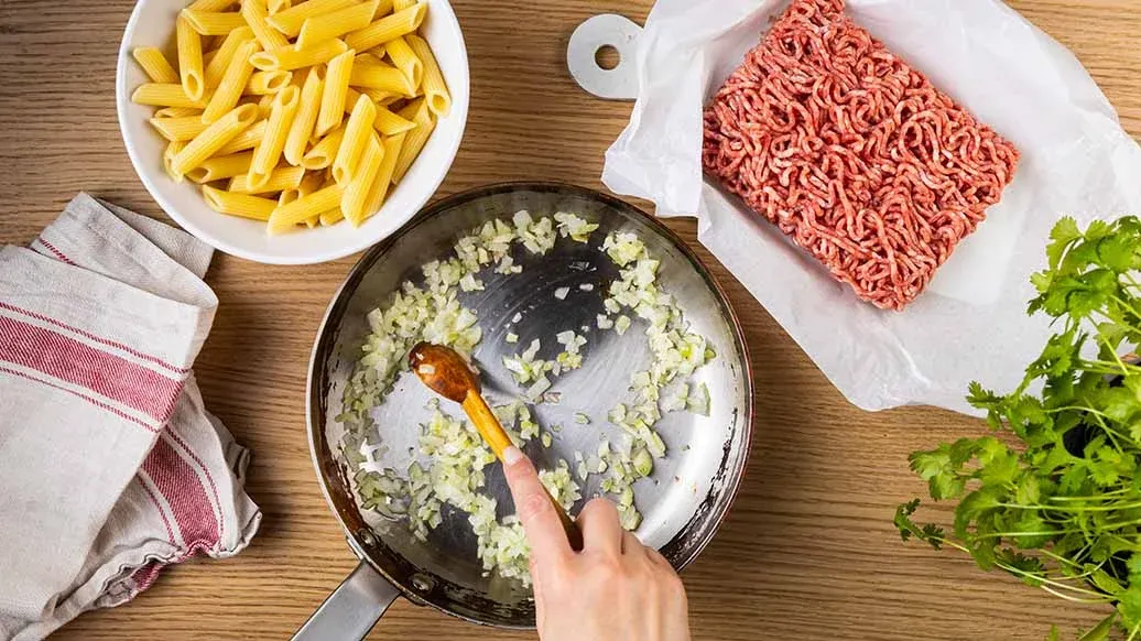 Penne’yi, paketindeki talimatlara göre pişirin. Yağı ısıtın. Ardından doğranmış soğan ve sarımsağı 1 dakika soteleyin. Dana kıymayı ekleyin, devamlı karıştırarak 3 dakika daha pişirin.